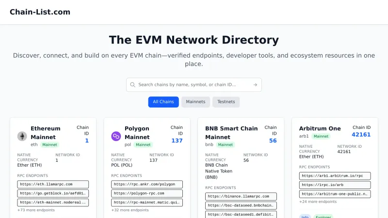 Chain-List.com - Complete EVM Blockchain Networks Directory | RPC Endpoints & Chain IDs