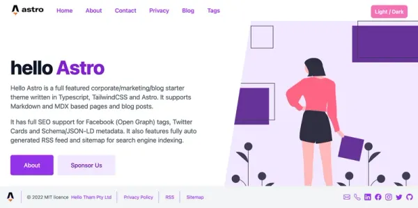 A full featured corporate/marketing/blog starter theme written in Typescript, TailwindCSS and Astro. It supports Markdown and MDX based pages and blog posts.
