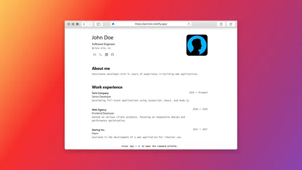 A really good portfolio template, using JSON Resume. Lightweight, printable, plug and play. Features a hotkey command palette with quick links for bonus developer style points.