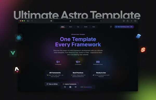 A preconfigured Astro theme that integrates Vue, React, Svelte, and SolidJS — all in one place, ready to use.