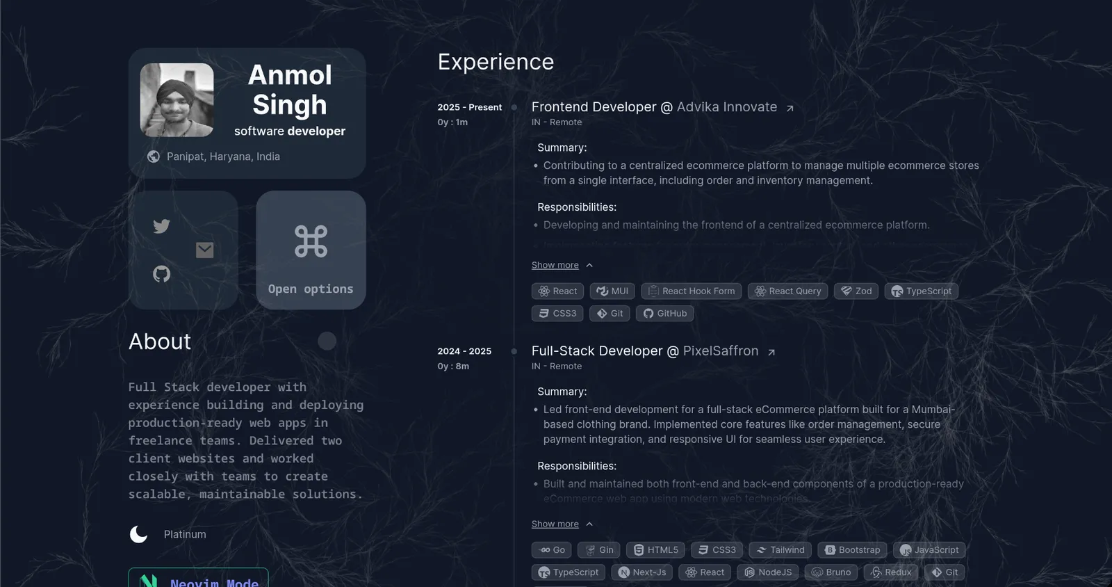 A customizable developer portfolio with multiple themes, light/dark modes, and a unique Neovim mode for a coding-inspired look.