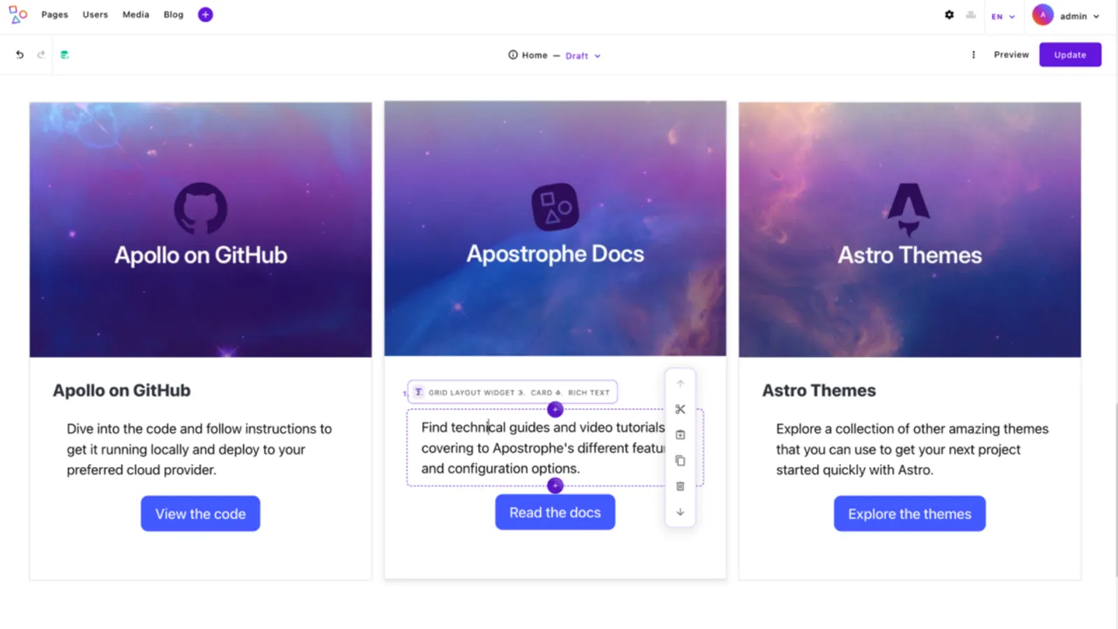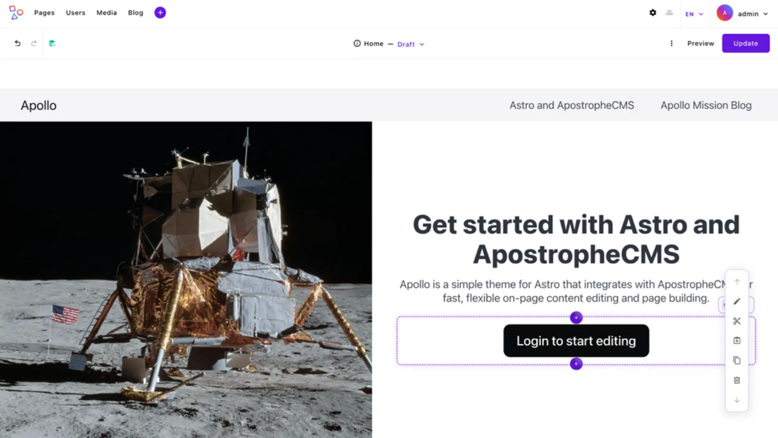 Apollo is a flexible Astro theme that integrates directly with ApostropheCMS, enabling full in-context editing on an Astro-powered frontend. Designed for developers who want the best of Astro’s modern frontend architecture paired with a powerful, editor-friendly CMS, Apollo makes it easy to manage and edit content while maintaining performance and flexibility.