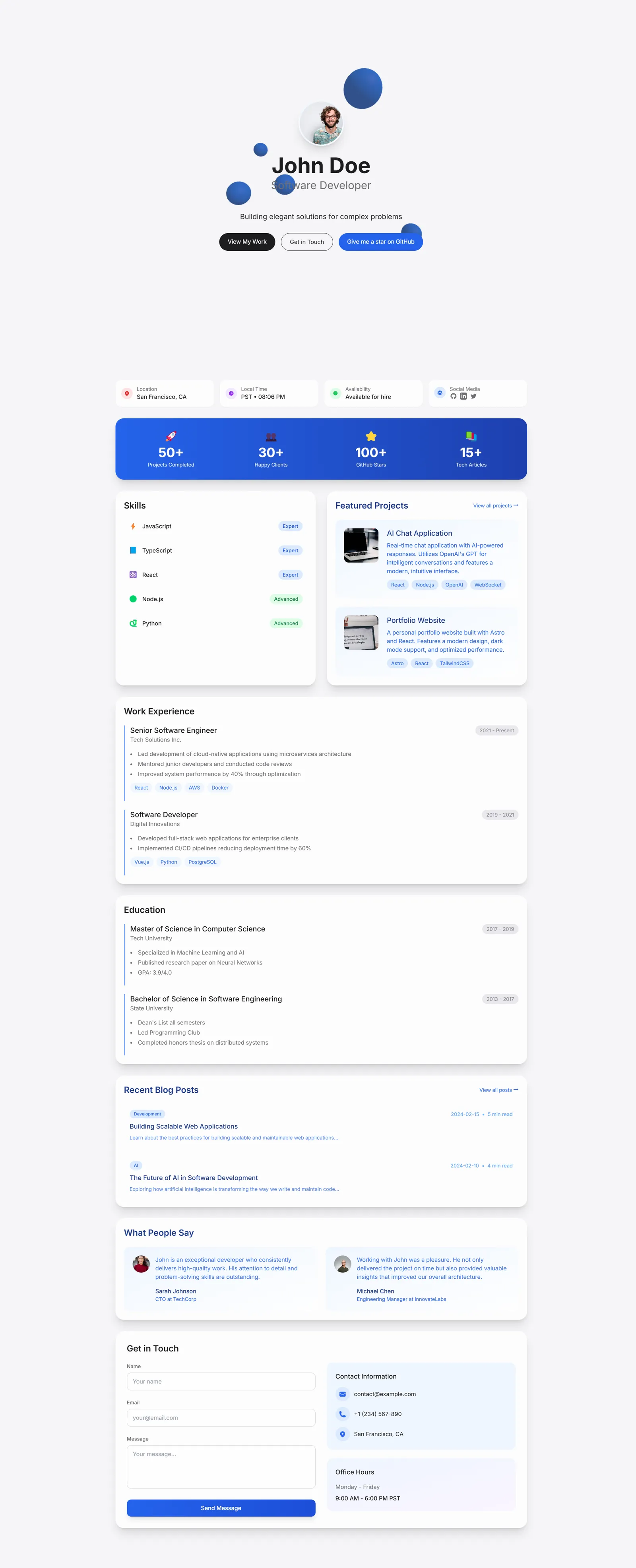 This is a template with a highly minimalist style, greatly inspired by Apple's design concept. It is built with Astro, TailwindCSS, GSAP, and Three.js.
