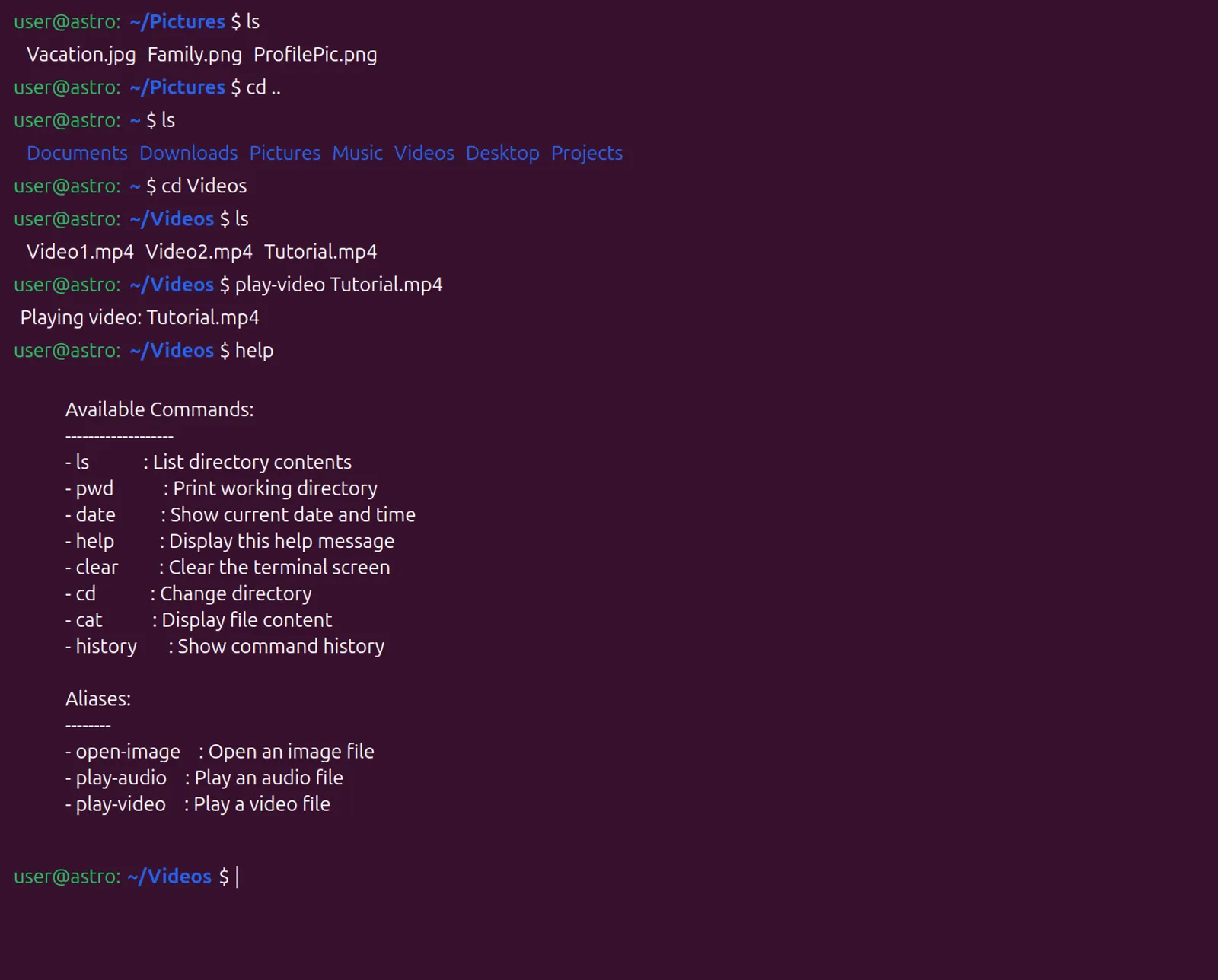 Simulates a Linux terminal where users can execute common commands like: