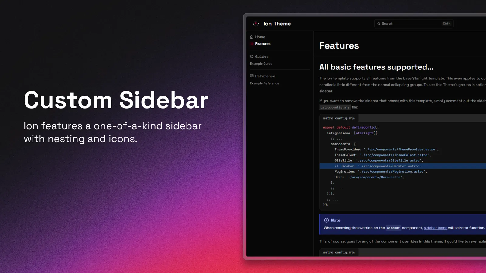 Ion is a Starlight template/theme that seeks to provide a modern look while maintaining all features of Starlight and even adding some new ones.