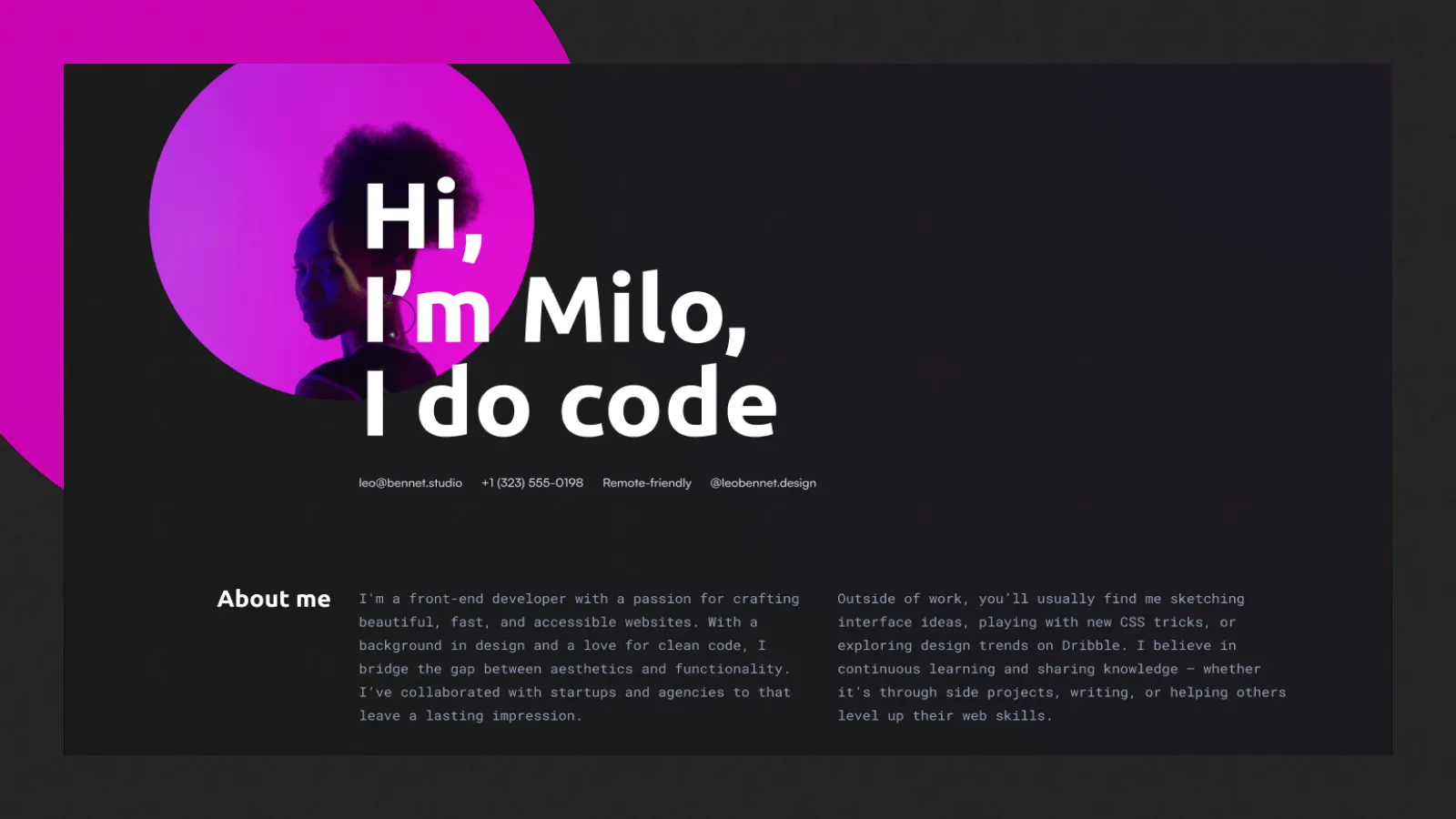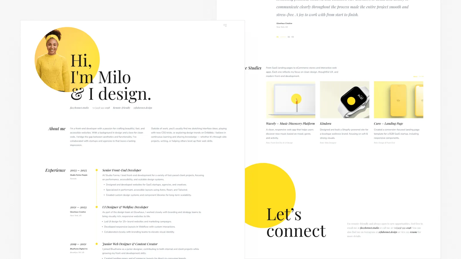 Milo is an elegant and production-ready resume template built with Astro and Tailwind CSS. Designed for developers, designers, and creatives, Milo offers a clean, modern way to showcase your skills, experience, and projects — all in a beautifully structured, single-page layout. It’s fully responsive, developer-friendly, and optimized, making it ideal for digital portfolios.