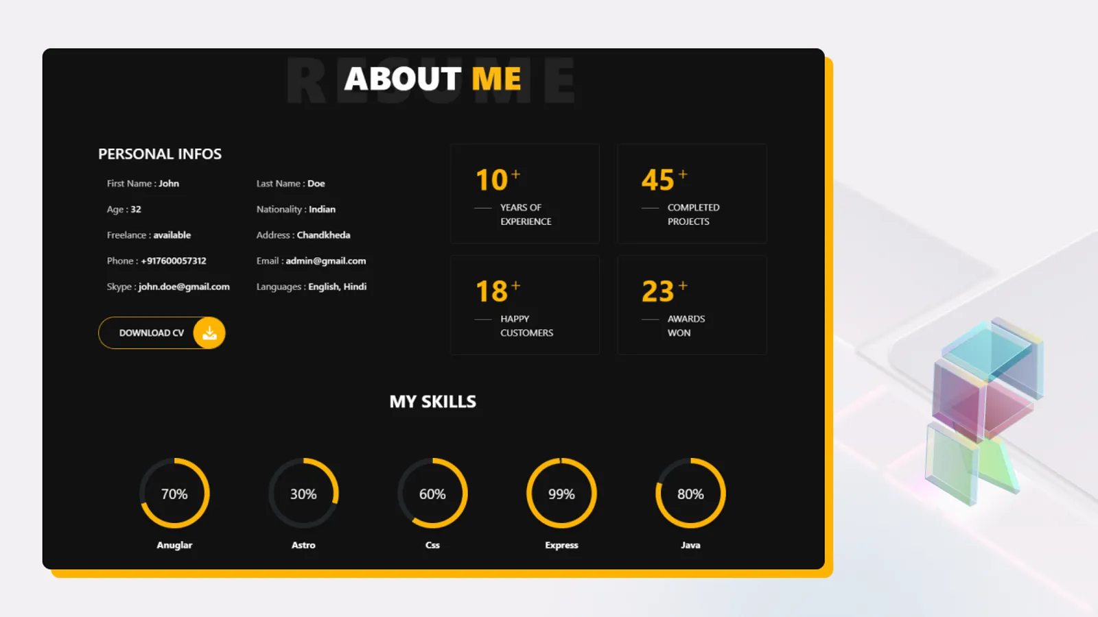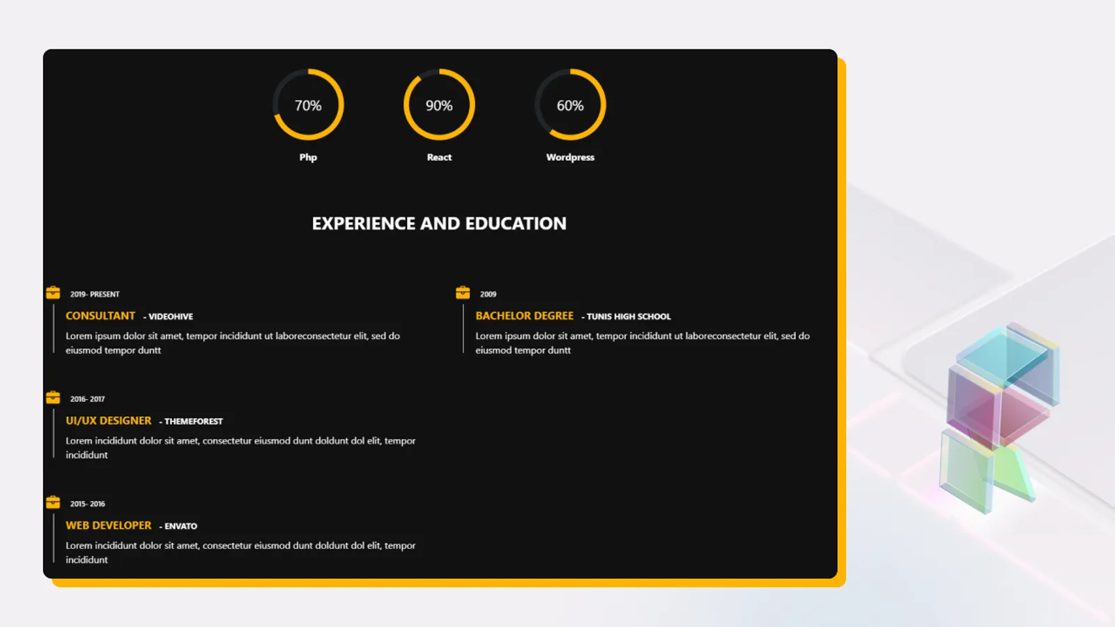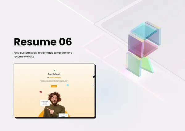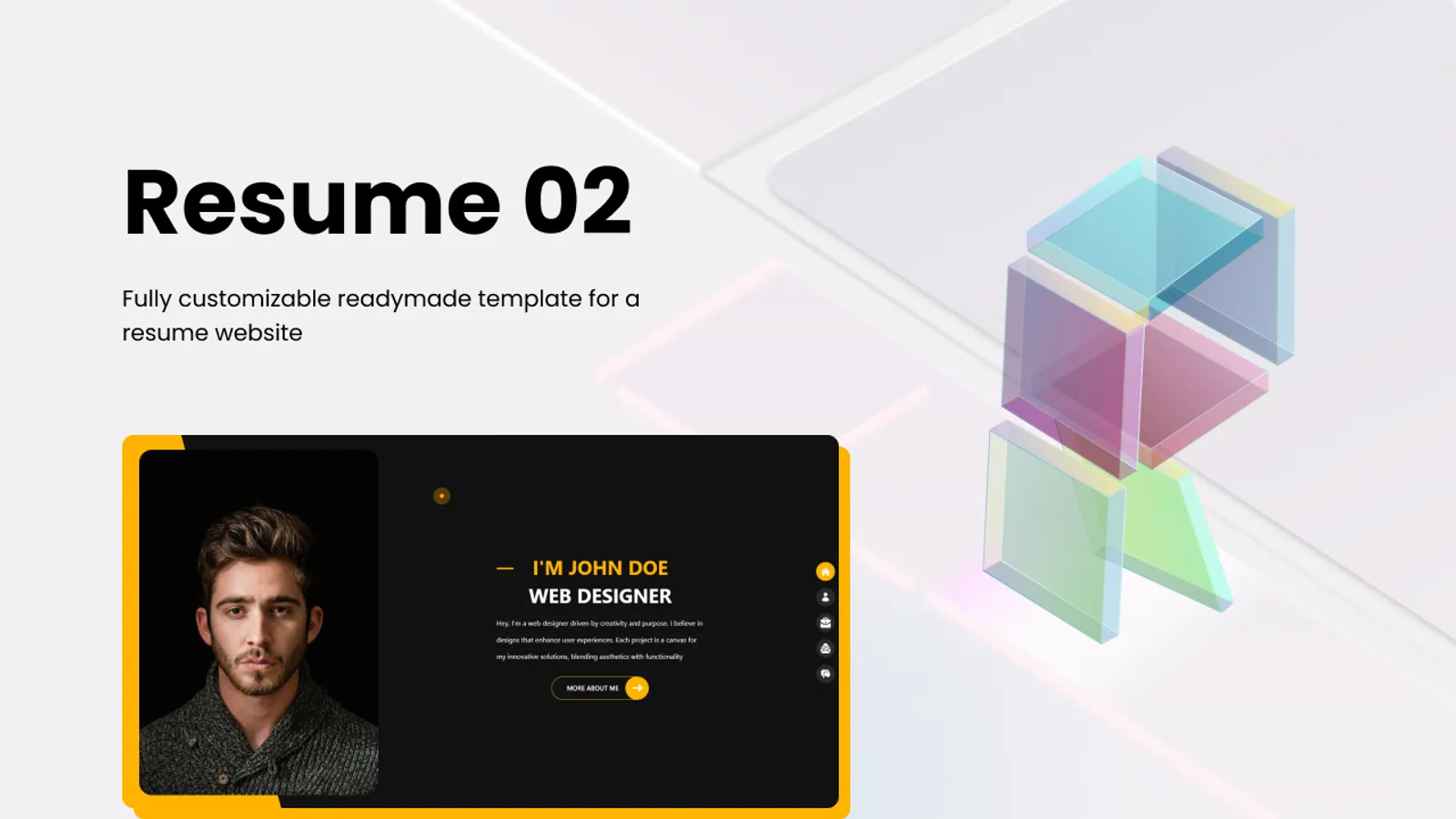 Resume02 is a website template that simplifies the process of developing a website for your resume. It has never been simpler to showcase your website creatively. This template allows you to present your skills and achievements on the Internet with an innovative website for which you do not need to write a single line of code.