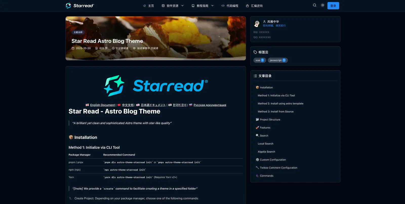You can customize theme configuration by modifying the <code style="background-color: rgb(255, 255, 255); color: rgb(50, 50, 50);">starread.config.ts</code> file in the root directory, including website title, navigation menu, author information, sidebar component display, etc.