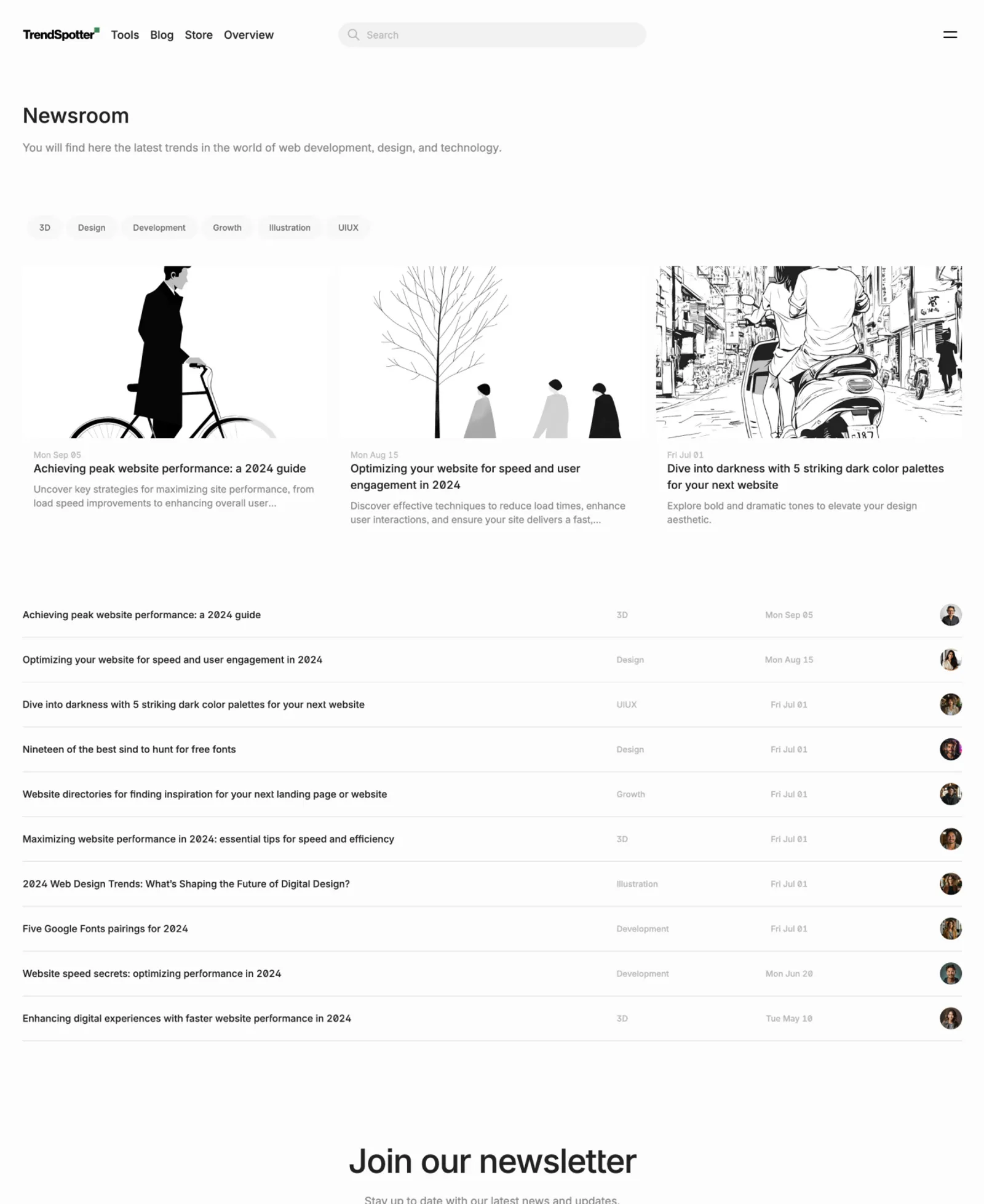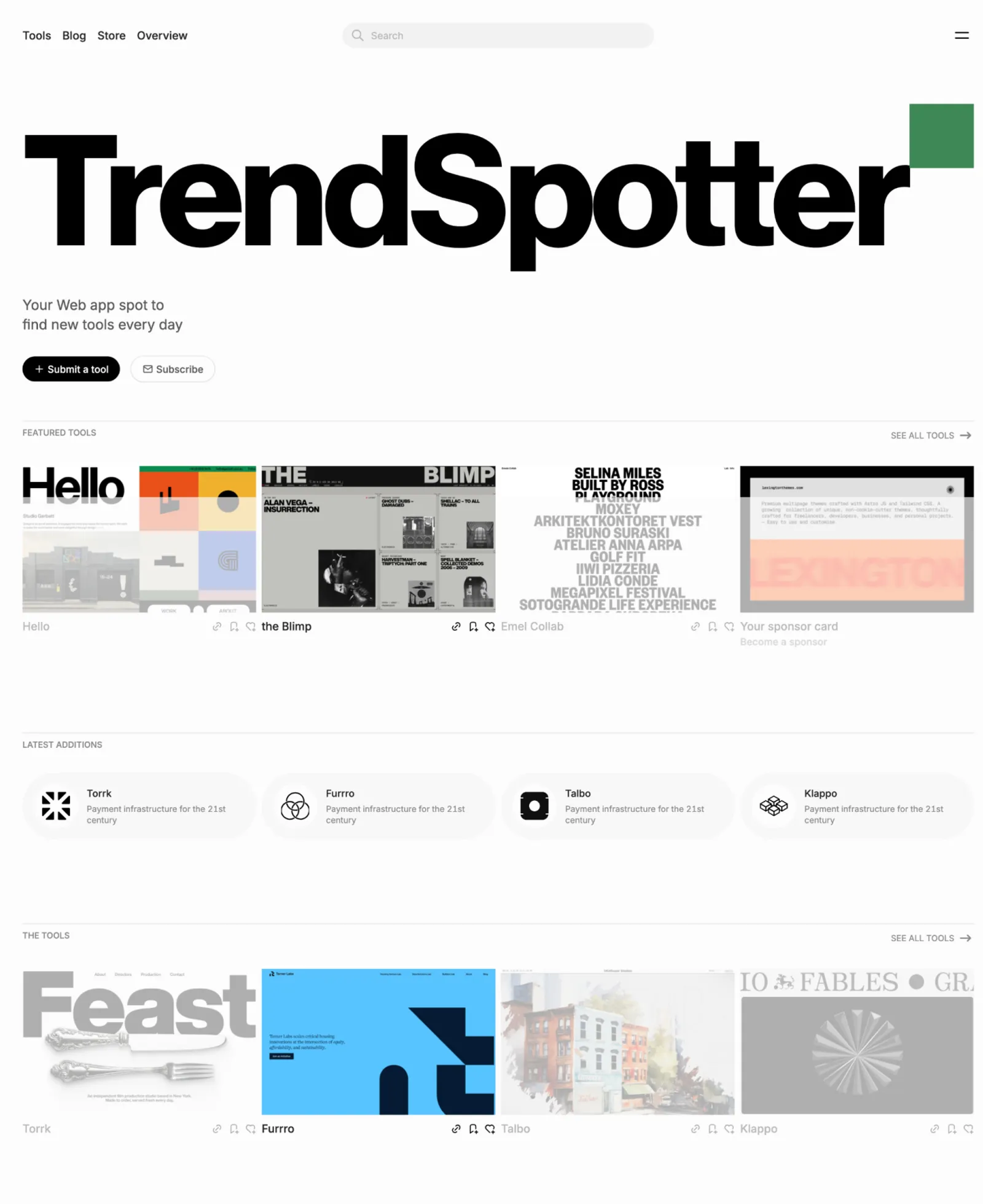 Trendspotter is a template for curated websites, making it easy for users to discover, save, and manage content through a personal dashboard.