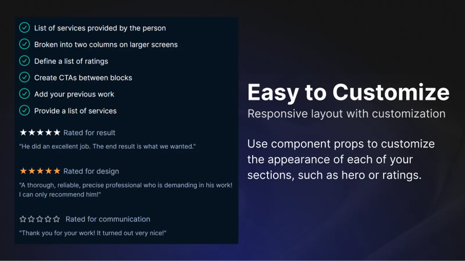 This template is designed to help you create a professional online portfolio fast. Whether you’re a designer, developer, writer, or artist, this template provides a flexible and easy-to-use structure to highlight your skills, share your projects, and attract potential clients or collaborators. You can easily customize the template with the following props: