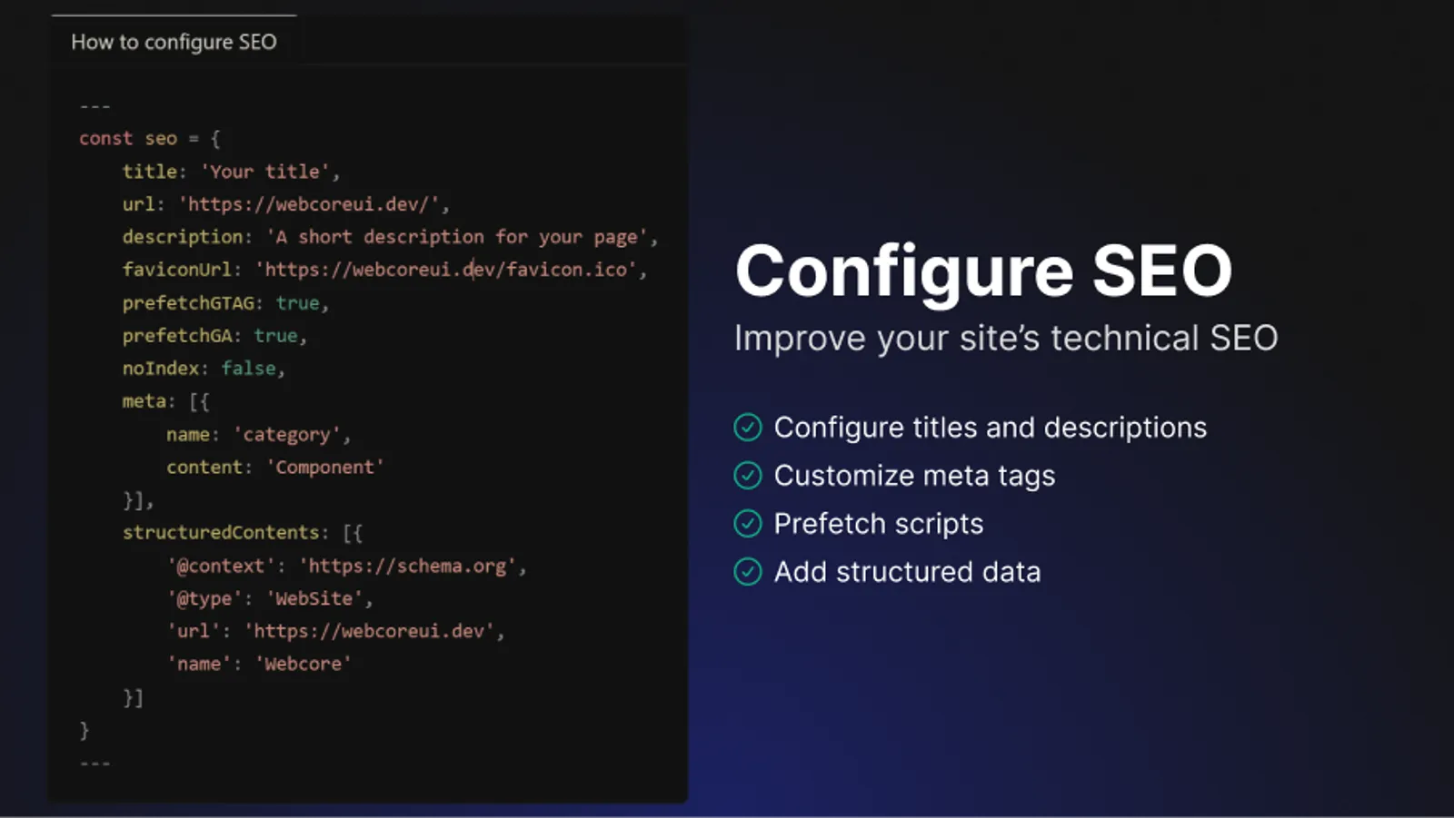 seo: { ... } // Your SEO configuration